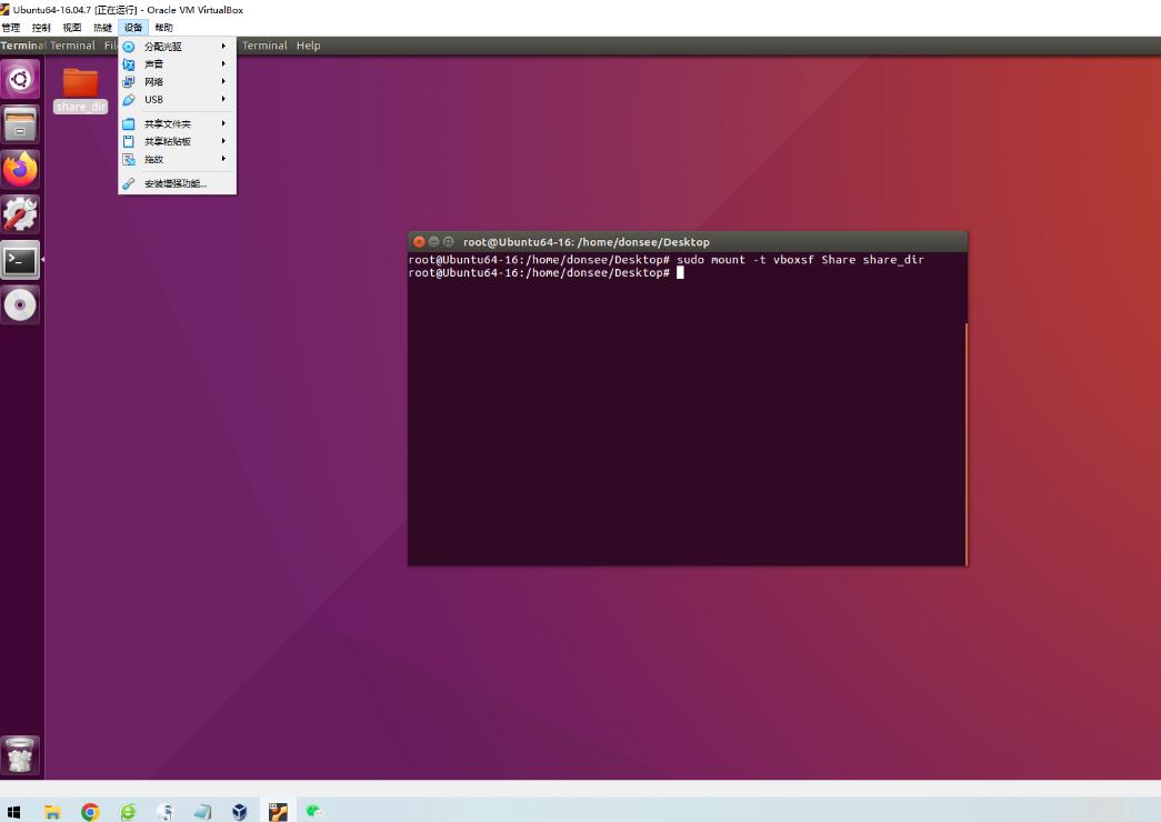 3、打开终端,输入共享命令:sudo mount -t vboxsf Share share_dir